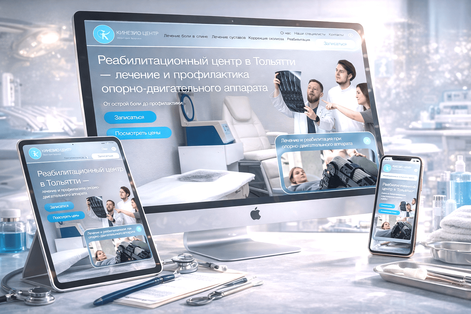 Здесь нет ощущения «медицинского сервиса с улыбкой». Скорее — центр управления: холодный свет, стеклянные поверхности, техника, сосредоточенные люди, которые анализируют снимки, а не позируют для стоков. Визуальный код сайта Knsmed.ru считывается моментально и сразу ставит метку — «здесь работают всерьез». Пользователь видит не обещания, а процесс — и это кратно усиливает доверие. UX-аналитика медицинских платформ фиксирует: демонстрация оборудования и командной работы повышает конверсию в первичную консультацию на 18–23% в нише реабилитации и ортопедии.