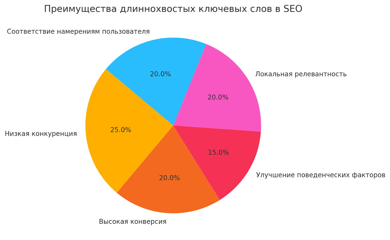 Высокая конверсия. Люди, использующие такие запросы, уже знают, что ищут, и с большей вероятностью совершат покупку или действие на сайте.