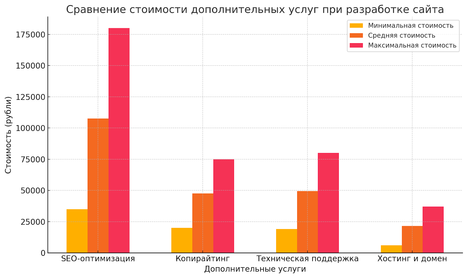 Помимо основной разработки, веб-студии Москвы предлагать дополнительные услуги, которые также влияют на общую стоимость проекта: